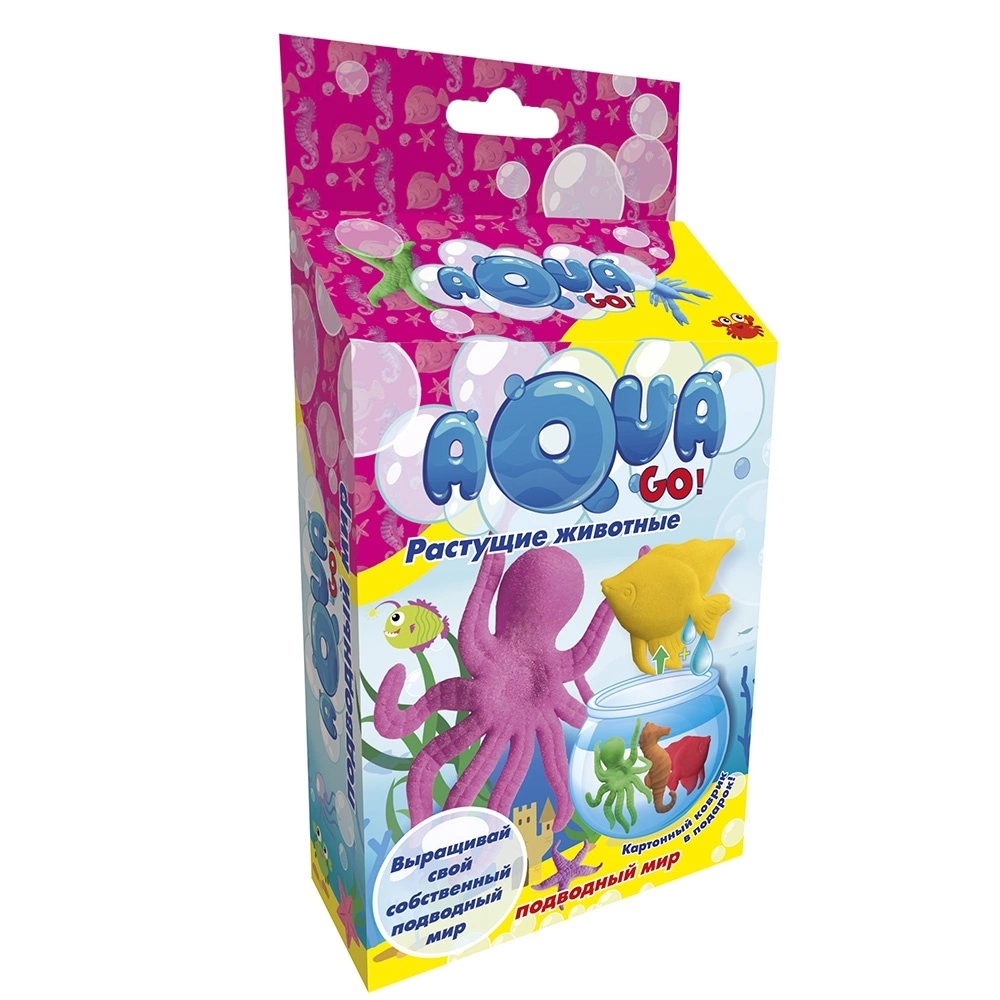 Захоплююча розвага - зростаючі в розмірах фігурки тварин з набору «Aqua Go Підводний світ». Досить опустити їх в воду, і вони збільшаться в розмірах у багато разів! Мешканці підводного світу стануть радісною пригодою. Яскраві і приємні на дотик вони розвеселять малюка, а крім того, дадуть можливість повправлятися маленьким пальчикам. Ігри з ними доставлять масу позитивних емоцій і допоможуть зняти стрес. Фігурки з матеріалу Orbeez безпечні для здоров'я і виготовлені з харчових матеріалів володіють абсорбуючі властивості. Для зростання фігурок необхідна вода в достатній кількості, максимальні розміри досягаються після 4-6 годин. Зберігати готові кульки необхідно в герметичному контейнері. У комплекті є яскрава непромокаючий підкладка з картинами підводного світу.