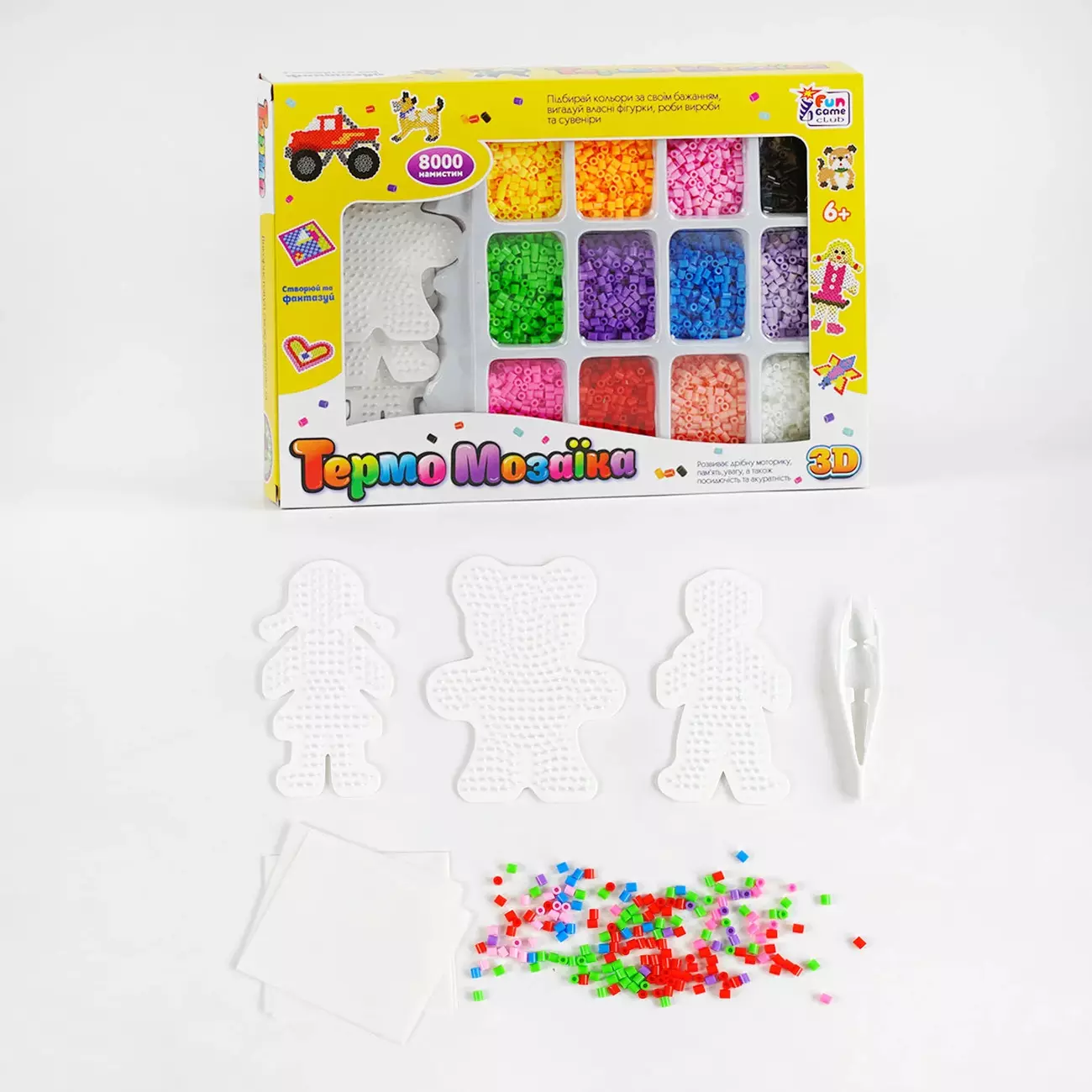 Термомозаїка - цікавий вид рукоділля, принцип якого полягає у викладанні зображень маленькими різнокольоровими намистинками з термопластичної пластмаси на спеціальній основі, які після нагрівання склеюються між собою в один цілісний виріб. Такий вид декоративно-прикладного мистецтва впливає на розвиток творчого потенціалу та фантазії, вчить поєднувати кольори, дає можливість проявляти індивідуальність та генерувати креативні ідеї, тренує координацію рухів та дрібну моторику, що позитивно впливає на мовленнєву активність дитини. Особливості: - 8000 різнокольорових намистин; - набір для творчості містить 3 багаторазові основи; - елементи поєднуються між собою під впливом температури завдяки прасці; - до набору додається термопапір; - зручний пінцет для викладення намистин; - набір стимулює розвиток дрібної моторики, творчих здібностей дитини, спонукає до генерування креативних ідей, уважності та акуратності.