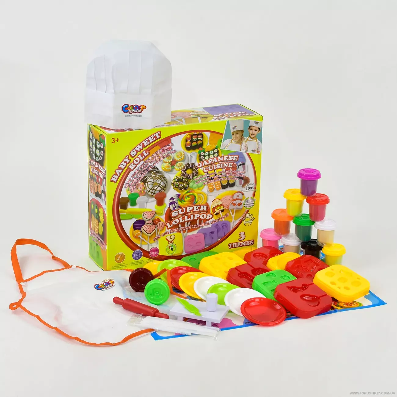 Дитячий ігровий набір для ліплення 8803 об'єднує в собі дві кондитерські теми: - японські страви; - солодкі ласощі. Тісто для ліплення не дозволить пальчикам нудьгувати - з нього можна ліпити фігурки, використовуючи формочки, що входять в ігровий комплект, або власну фантазію. На спеціальному килимку намальований шкільний автобус, а напрям його руху пролягає крізь різноманітні солодощі та японські страви, які так люблять дорослі і діти в усьому світі. Тісто чудово підійде для уроків праці в школі, для виробів в садку і для домашньої гри. Завдяки набору, ваш малюк поліпшить дрібну моторику, розвине творче і логічне мислення, навчиться поєднувати кольори і отримає багато годин захоплюючої і корисної гри з яскравим набором для дитячої творчості. Комплектація: - 12 баночок з тістом для ліплення; - фартух і кухарський ковпак; - килимок; - форми для японської кухні; - форми для солодощів; - столові прибори; - посуд.