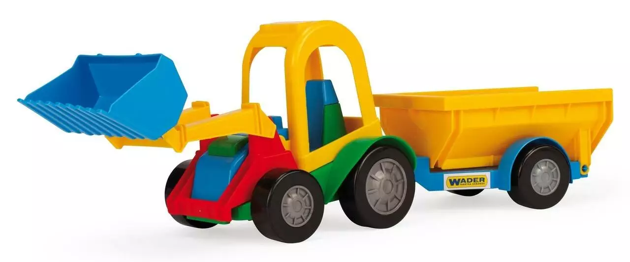 Іграшкова машинка трактор-баггі з ковшем і причепом - яскрава і цікава іграшка для задоволення і розвитку малюка. Трактор-баггі з ковшем і причепом має рухливі елементи, завдяки чому грати дітям буде ще цікавіше. Машинка має міцну конструкцію, малу вагу і проста в управлінні. Іграшкова машинка ідеально підходить як для розваг вдома, так і в пісочниці. Машинка пройшла випробування в Європі. Доступні два варіанти причепа: причіп з конячкою, кузов. Доступна в 4-х кольорах: синій, червоний, жовтий, зелений.
