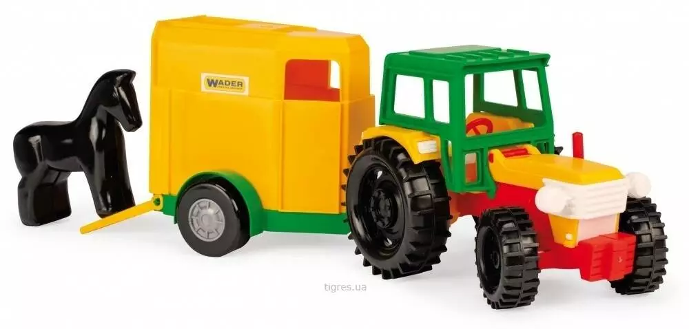 Іграшкова пластмасова машинка трактор з причепом відрізняється міцною і надійною конструкцією. Це прекрасний подарунок для дітей, які люблять функціональні машинки. Машинка містить рухливу кабінку і причіп, що робить процес гри захоплюючим і пізнавальним. Дитина буде грати з задоволенням і розвивати фантазію, моторику рук і багато інших якостей. Вона представлена у двох варіантах: трактор зі стандартним причепом і трактор з причепом для перевезення коней. У комплект другого варіанта також входить коник. іграшкова машинка пройшла випробування в Європі. Матеріал - поліпропілен. Довжина - 38,5 см. Вік: від 3 років Розмір: 38,5x15x12.5cm / 0.340kg