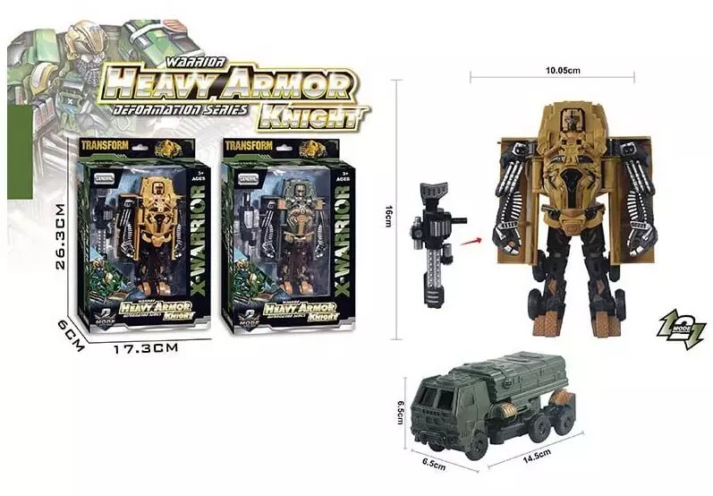 Наша Земля постійно знаходиться у стані боротьби між двома расами міжкосмічних роботів, але ми не завжди помічаємо це, бо вони можуть маскуватися, трансформуючись у різноманітні транспорти чи технологічні винаходи. Трансформер “Heavy Armor Knight” один з них, та зараз він у пошуках відважного героя, який допоможе рятувати світ від лиха! Стильний робот має вигляд могутнього солдата, який у мить перетворюється на крутий спецтранспорт. А для збільшення бойової сили у наборі можна знайти гарно деталізовану зброю. Відправляйтесь у незабутні пригоди разом з трансформером та вершіть справедливість! Особливості: - стильний дизайн улюблених героїв дитячих фільмів про роботів; - тематичне забарвлення крутої спецтехніки з різними характерними декоративними зображеннями; - перетворюється на трансформера за 6 кроків; - високоточна деталізація поверхні іграшки; - кінцівки автобота легко провертаються; - круті аксесуари у вигляді зброї; - стане родзинкою у вашій колекції іграшок; - допоможе відтворити всі найнезабутніші та гостросюжетні ігри.