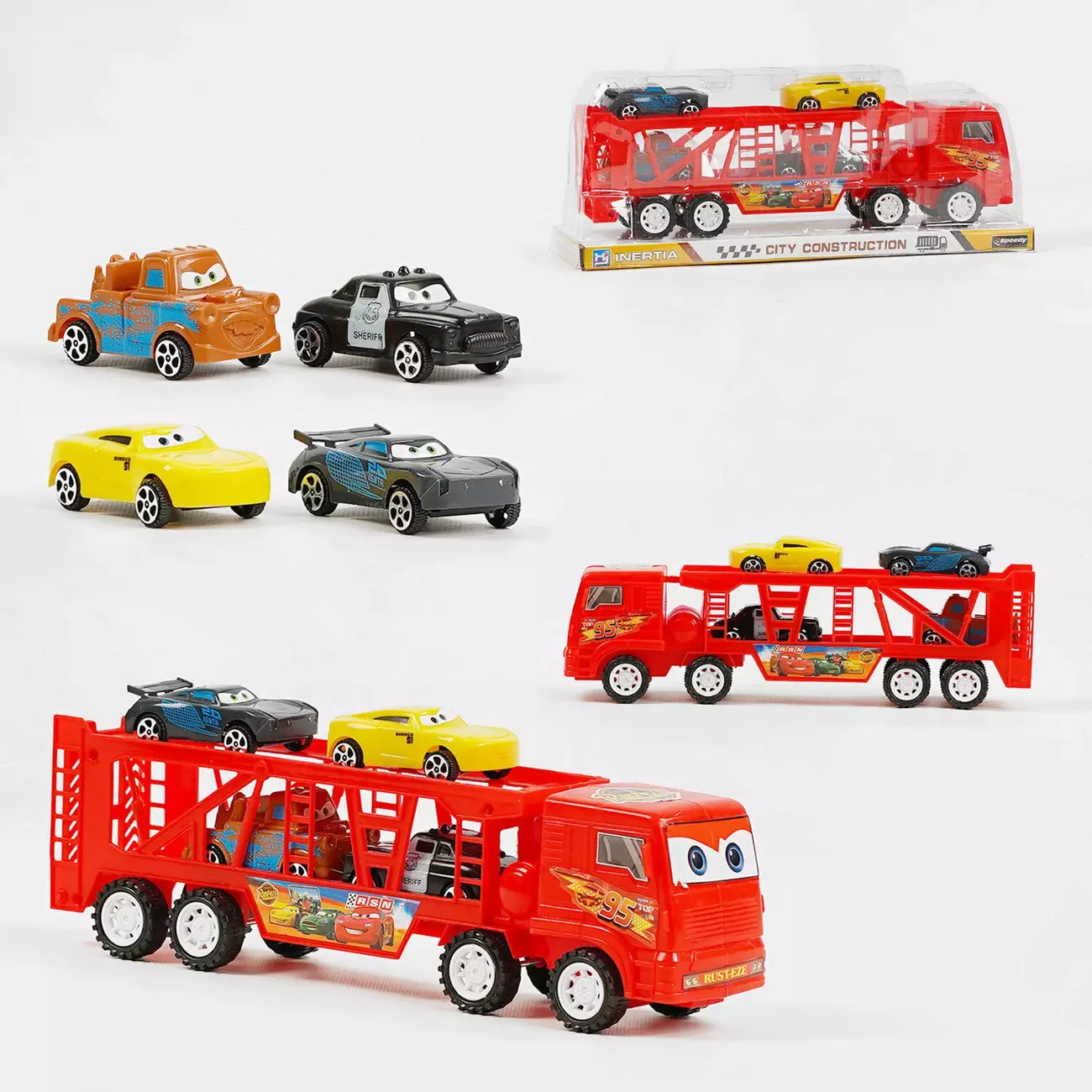 Дизайн цього трейлера створений за мотивами популярного мультфільму. Трейлер прикрашений наліпками з зображеннями героїв мультика та у своїй комплектації має ще 4 машинки, які вантажівка буде у безпеці доставляти до пункту призначення. Трейлер оздоблений 2 поверхами, де всі герої мультфільму зможуть зручно розташуватися і доїхати по своїм справам. Такий набір допоможе зробити дитячу гру ще цікавішою та створити нові сюжети. Особливості: - трейлер має інерційний механізм; - 4 машинки-герої не мають інерційних механізмів; - машинки прикрашені наліпками та яскравими написами; - яскраві кольори; - колеса машинки виконані з пластику з фактурним візерунком; - іграшки виготовлені з якісного пластику, який є безпечним для дітей.