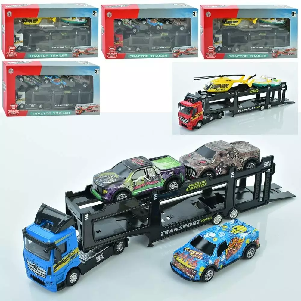 Трейлер M7128-19-39 гумові колеса, 2 види (машина, вертоліт+катер), кор., 31,5-15,5-5,5 см.
