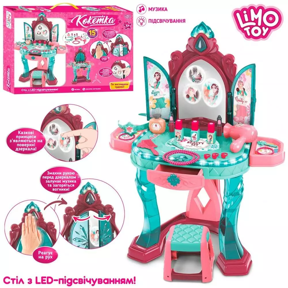 Трюмо 008-988 зі стільчиком, фен, аксесуари, 15 пред., муз., світло, бат., кор., 59-42,5-12 см.