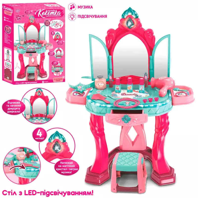 Трюмо 008-989 стілець, фен, флакони, обруч, прикраси, муз., світло, бат., кор.,42,5-59-12см.
