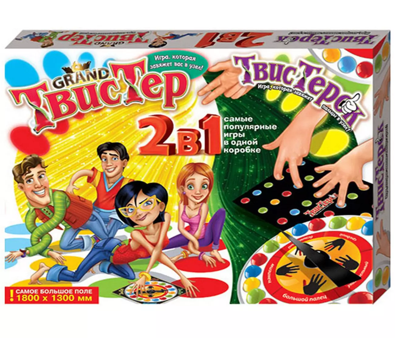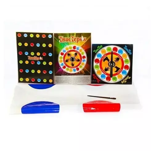 Правила гри: У цій грі учасники переміщаються килимком з кольоровими колами. За допомогою рулетки суддя визначає колір, на який необхідно змістити руку або ногу, ускладнюючи цим завдання по переміщенню, і змушує учасника приймати найнеймовірніші пози. Той, хто не стримує рівновагу, вибуває з гри. Перемагає останній гравець, який утримав рівновагу і залишився на килимі. Недосвідченому гравцеві може здатися, що все досить просто, але через деякий час йому доведеться неабияк попрацювати, щоб зуміти втриматися на полі. У комплекті знаходиться все необхідне для улюбленої гри в твістер і «Твістерок». Грати у твістер можна як дітям, так і дорослим, які люблять весело та активно проводити дозвілля. Крім великої гри, у комплекті також знаходиться її міні-версія під назвою «Твістерок» - грати в неї потрібно, використовуючи не тіло, а лише пальці рук, що не менш цікаво. Комплектація: 1 ігрове поле "Гранд Твістер", 2 кнопки, 2 стрілки, 1 ігрове поле "ТвістерОк", 1 рулетка.