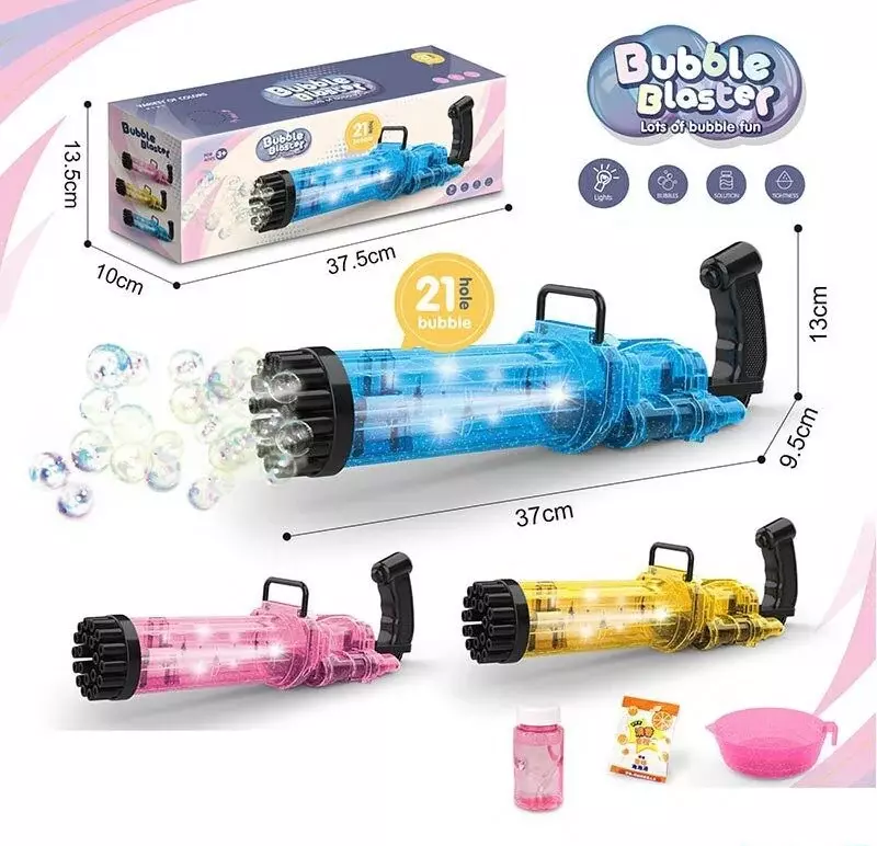 Пускати мильні бульбашки - одне із найцікавіших занять не тільки для дітей, але навіть і для дорослих. Адже бульбашки, що переливаються, весело кружляють у повітрі, піднімаючи настрій усім оточуючим. Представляємо Вашій увазі оригінальну установку з мильними бульбашками у вигляді потужного бластера! Особливості: - сучасний дизайн; - ефектне підсвічування; - зручна ручка-тримач; - пляшечка з мильним розчином; - місткість для мильного розчину; - працює від 4х батарейок типу "АА"; - автоматичне видування чарівних пухирців; - стік з концентратом для мильних бульбашок.