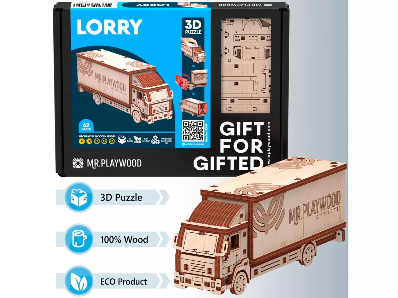 Маленька модель вантажівки легко може стати вашим улюбленим дерев'яним набором. Зберіть дерев'яний набір відповідно до інструкції. Коли вантажівка буде готова, ви можете відкрити двері та помістити в неї дрібні вантажі, щоб транспортувати їх до місця призначення. Акуратно від'єднайте деталі від пластин і зберіть дерев'яний набір без клею. Всі необхідні деталі входять в комплект. Збирайте та насолоджуйтесь Mr. Playwood! Кількість деталей 42 деталей Для дітей від 14 років. Розмір моделі в зібраному виді, мм 147*40*60 Розмір упаковки см 24*18*3