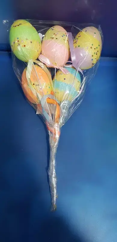 У прозорому пакеті п'ять яєць на довгій шпажці. В упаковці різні забарвлення сувенірів. Допоможуть Вам створити святковий настрій на Великдень.