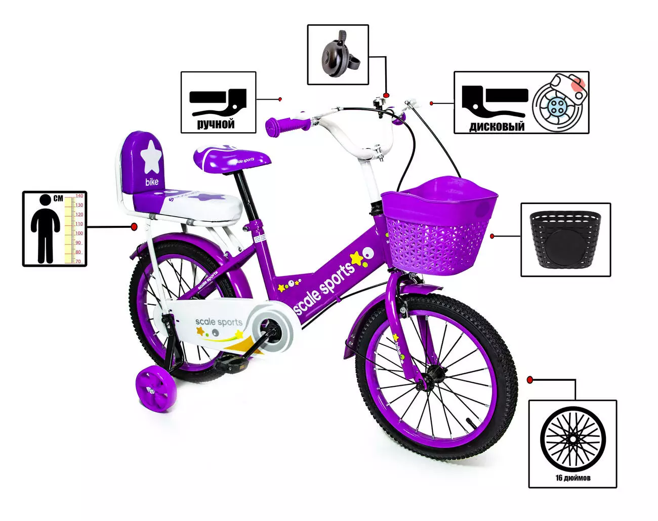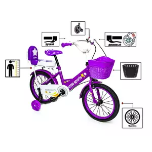 <p>Детский двухколесный для девочек велосипед<strong> 16 дюймов" Фиолетовый T15 </strong>предназначен для юных велосипедистов! Стильный дизайн велосипеда, его комплектация и надежная конструкция сделают прогулки на свежем воздухе активными и безопасными.</p><br /> <p>Конструкция велосипеда выполнена из прочного стального сплава, который не даст его раме деформироваться и обеспечит её устойчивостью к повреждениям.</p><br /> <p>Рама представленной модели с удобной конструкцией, что делает её более удобной для ребенка. </p><br /> <p>Колеса 1<strong>6 дюймов" Фиолетовый T15 </strong>с надувной камерой на металлических дисках со спицами. Над каждым колесом установлены крылья. Они предотвратят разбрызгивания грязи и воды и защитят ребенка и сам велосипед от загрязнений.</p><br /> <p>Руль и сидение велосипеда регулируется по высоте, что даст возможность подобрать оптимальный размер для каждого ребенка индивидуально. Ручки руля с резиновыми нескользящими накладками.</p><br /> <p>Безопасность во время катания обеспечат: металлический защитный щит на цепи велосипеда, мягкая накладка на его руле. <strong> 16 дюймов" Фиолетовый T15 </strong>оборудован передним и задним ручным дисковым механическим тормозом.</p><br /> <p>Специально для начинающих велосипедистов данная модель комплектуется двумя съемными светящимися страховочными колесами.</p><br /> <p>Дополнительно велосипед оборудован задним сидением с стильным дизайном.</p><br /> <p><strong>Характеристики:</strong></p><br /> <p>Возраст: 4-8 лет, рост: 100-140 см;</p><br /> <p>Диаметр колес: 16” (примерно 40.6 см), ширина - 6 см;</p><br /> <p>Высота сидения от пола: max-72 см (регулируемая);</p><br /> <p>Руль: высота от пола - 80 см (регулируемая), ширина - 50 см;</p><br /> <p>Общая длина велосипеда: 108 см;</p><br /> <p>Длина рамы: 39 см.</p><br /> <p>Велосипед собран на 75 %;</p><br /> <p>Вес велосипеда с коробкой: 12 кг.</p><br />