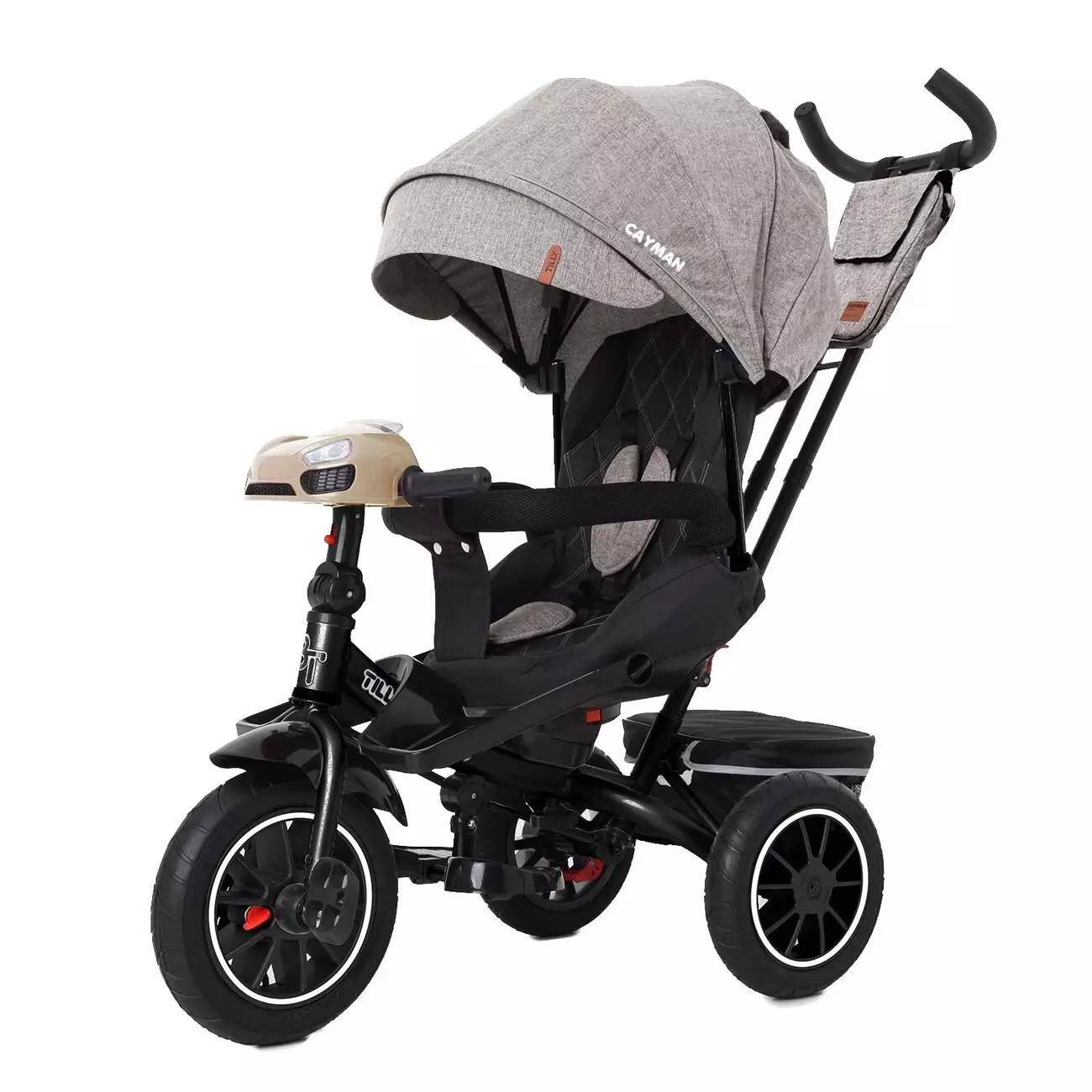 Якісна і надійна модель триколісного велосипеда TILLY Cayman T-381 зможе стати на кілька років улюбленим засобом пересування для маленької дитини, адже функціональність дозволить легко трансформувати його конструкцію, роблячи її зручною як для однорічного малюка, так і для трирічної дитини. TILLY Cayman T-381 виконаний на основі сталевої рами, вдало доповненої трьома гумовими надувними колесами, одним переднім 12 дюймовим і двома 10 дюймовими задніми, які можна зафіксувати стоянковим тормозом.Есть в ньому і зручне сидіння зі спинкою, яке можна розгорнути спиною по ходу руху . За безпеку відповідають триточковий ремінь, бампер і захист від сповзання. Також, TILLY Cayman T-381 оснащений: капюшоном, що складається підставкою для ніжок, кошиком для дрібниць і ігровий музичної панеллю з пультом дистанційного керування. Саме такий набір функцій, зробить прогулянки зручними, приємними і захоплюючими для Вас і для вашого малюка.