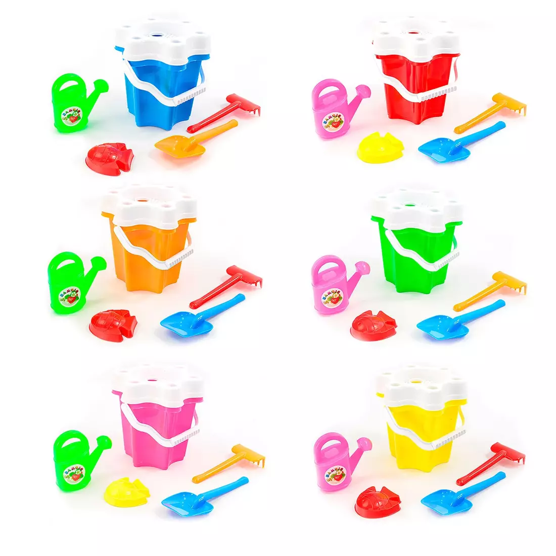 Набір дитячий «Відро «Квіточка №3». Яскравий, різнобарвний набір стане невід'ємною частиною літніх прогулянок на свіжому повітрі. У набір входить: - відерце; - сито; - лопатка; - граблі; - дві пасочки; - лійка. Продукція виконана з екологічно чистої та високоякісної сировини. Розмір відра: 20*24 см.