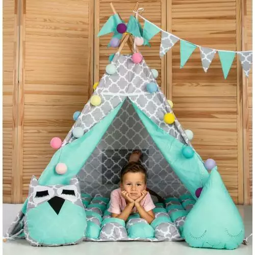 Вигвам Хатка комплект бонбон Солнце Бирюза с серым с подушками