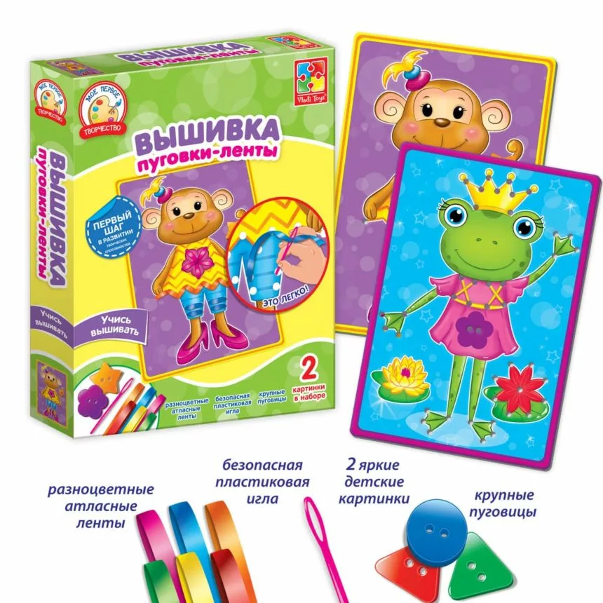 Перші набори для творчості — вишивка стрічками і гудзиками для малюків. У коробці є все необхідне: 2 картинки з добрими персонажами, безпечна пластикова голка, барвисті стрічки і великі яскраві гудзики! З ними дитина впорається сама — легко і просто! Кожна картинка-основа має отвори в які потрібно просунути голку. Ілюстрована книжечка-інструкція допоможе малюкові правильно зробити свої перші стібки. Результатом роботи стануть 2 красиві картинки, одну з яких можна закріпити на рамці (в комплекті) і поставити на стіл або повісити на стіну дитячої кімнати. Комплектація: — 2 картинки з отворами; — 1 пластикова голка з великим вушком»; — різнокольорові стрічки; — яскраві гудзики; -- книжечка-інструкція -- рамка-підставка