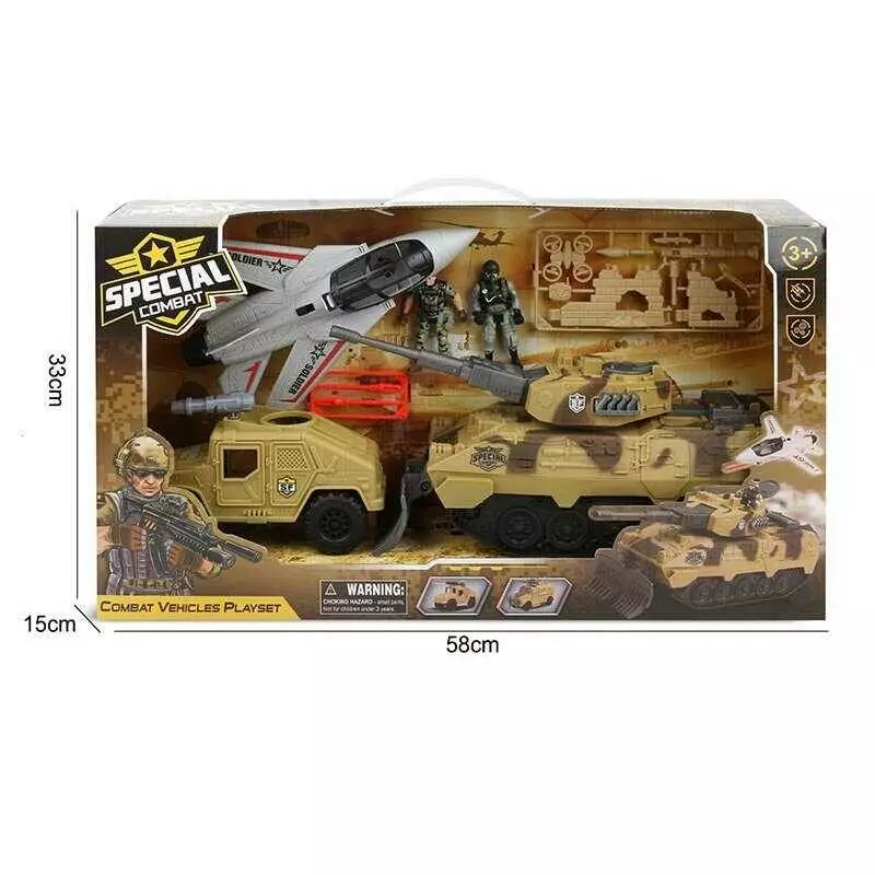 Військовий набір G 3109-56 (12) літак, танк, бронеавтомобіль з запускачем снарядів, 2 фігурки військових, рухомі елементи, в коробці