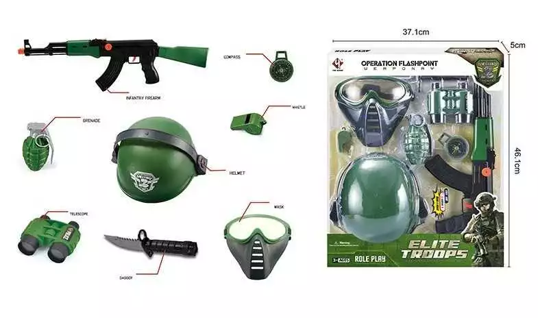 Військовий набір M 017 A (24/2) 8 елементів, автомат з тріскачкою, ніж, каска, маска, свисток, аксесуари, в коробці