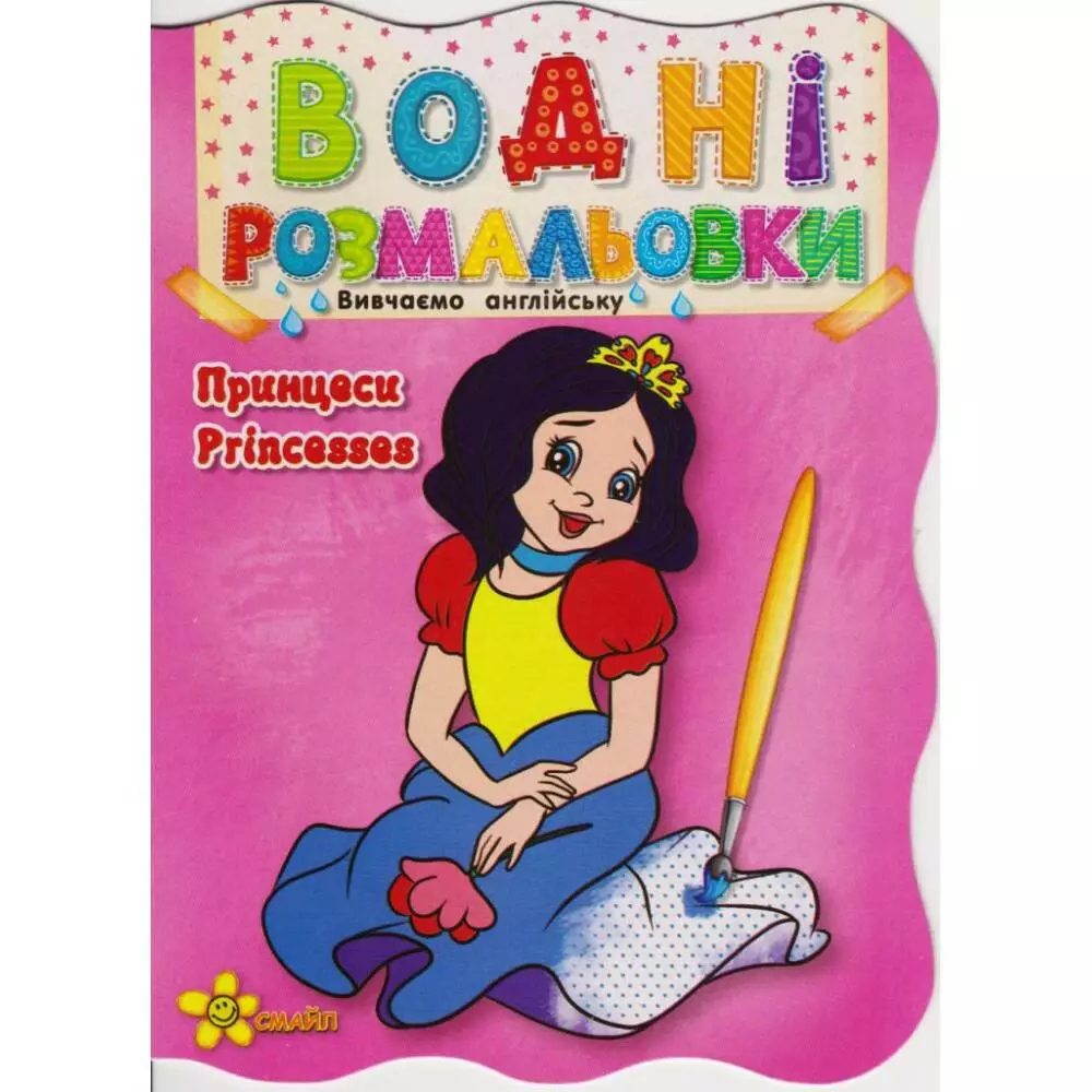 Водні розмальовки Принцеси Видавництво СМАЙЛ. Серія "СОНЕЧКО". Формат А5. Офсет. 8 сторінок (4 водна розмальовка + 4 під олівці або фарби) Українська та англійська мови.