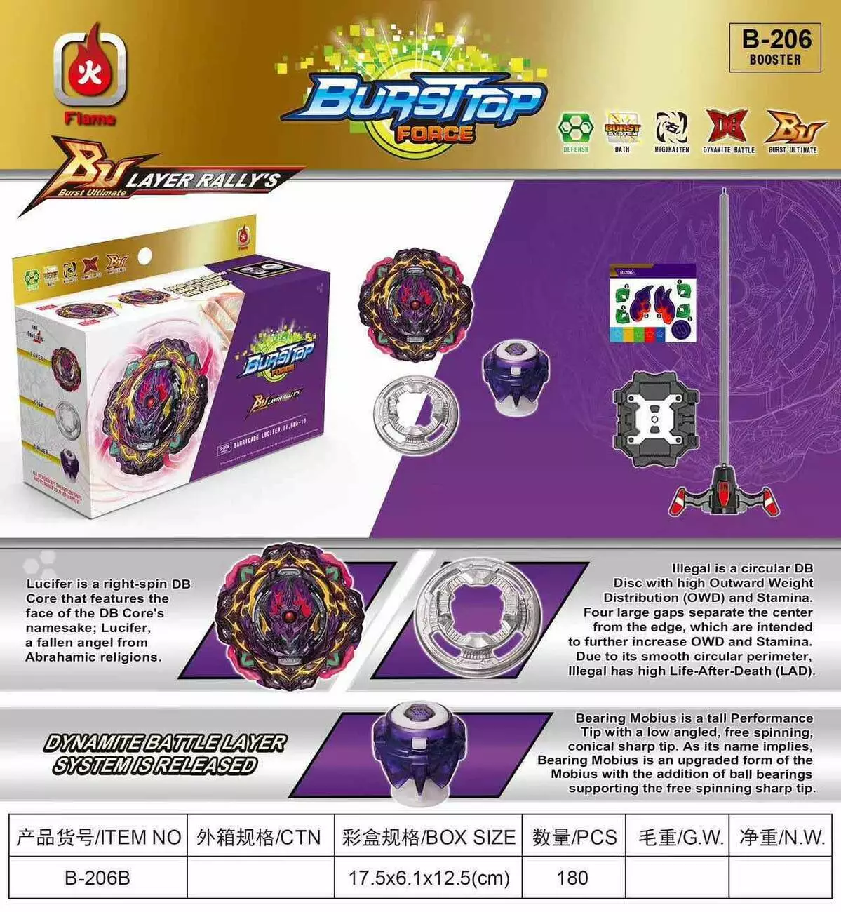 <p>Перед нами достойное продолжение семейства защитных блейдов Люцифера. Новая модель унаследовала от своих предшественников <strong>Variant Lucifer</strong> и <strong>Lucifer The End</strong> уникальный стиль и мрачную цветовую гамму. Относительно боевых характеристик они значительно выросли. Раскрывающиеся эластичные лопасти благодаря центробежной силе в сочетании с максимально подвижным устойчивым драйвером практически не оставляют шансов сопернику в его попытках нанести какой-то вред Люциферу. Кроме того, за счет особенностей брони и силового диска масса бейблейда равномерно распределена по всей длине круга, что положительно сказывается на длительности вращения, а соответственно и уровне выносливости конструкции в целом.</p><br /> <ul><br /> <li>особенность: гибкие раскрывающиеся лопасти;</li><br /> <li>модель по номеру: B-206;</li><br /> <li>полное название: Barricade Lucifer Illegal Bearing Mobius-10;</li><br /> <li>тип боя: защита;</li><br /> <li>сторона вращения: правая;</li><br /> <li>строение: Dynamite Layer System;</li><br /> <li>ядро: Lucifer;</li><br /> <li>энергетический слой: Barricade;</li><br /> <li>силовой диск: Illegal;</li><br /> <li>наконечник: Bearing Mobius;</li><br /> <li>Армор: 10.</li><br /> </ul><br />