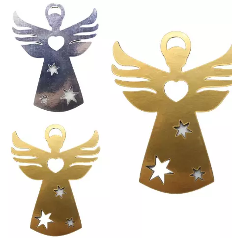 Чарівна ялинкова прикраса у вигляді силуету янгола. Прикраса двостороння: з одного боку золота, з іншого - срібна. У наборі є золотисті мотузочки, за допомогою яких прикрасу можна підв'язати будь-куди. Розмір ангелочка: 8.5х7 см