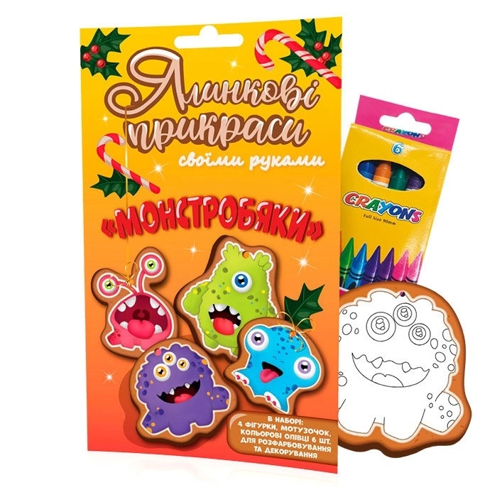 Іграшки, які малюк зможе самостійно розфарбувати. Після чого, ви можете разом з малюком повісити їх на святкову ялинку. Ці прикраси будуть вселяти радість і гордість дитині за те, що вона самостійно розфарбувала прикрасу і тепер іграшка знаходиться на новорічній ялинці. В наборі: 4 фігурки у вигляді пряників з цупкого картону, мотузочок, кольорові олівці 6 шт. для розфарбовування та декору. Розмір фігурки близько 9 см. Розмір упаковки 115*190 мм