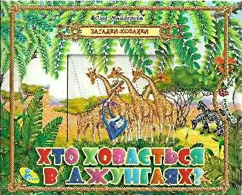 Книга картонна, картон хром-ерзац, друк офсетний, 5 разгорток, українська мова. Зручний формат, одна суцільна илюстрація на разгортці, текст - цікава загадка, а відгадка - сюрприз - з'являється якщо потягнути за спеціальну вкладочку. Розмір 210х170 мм. Серія "Загадки-хованки". "Хто ховається в джунглях?", Олег Майборода. Видавництво "Кредо".