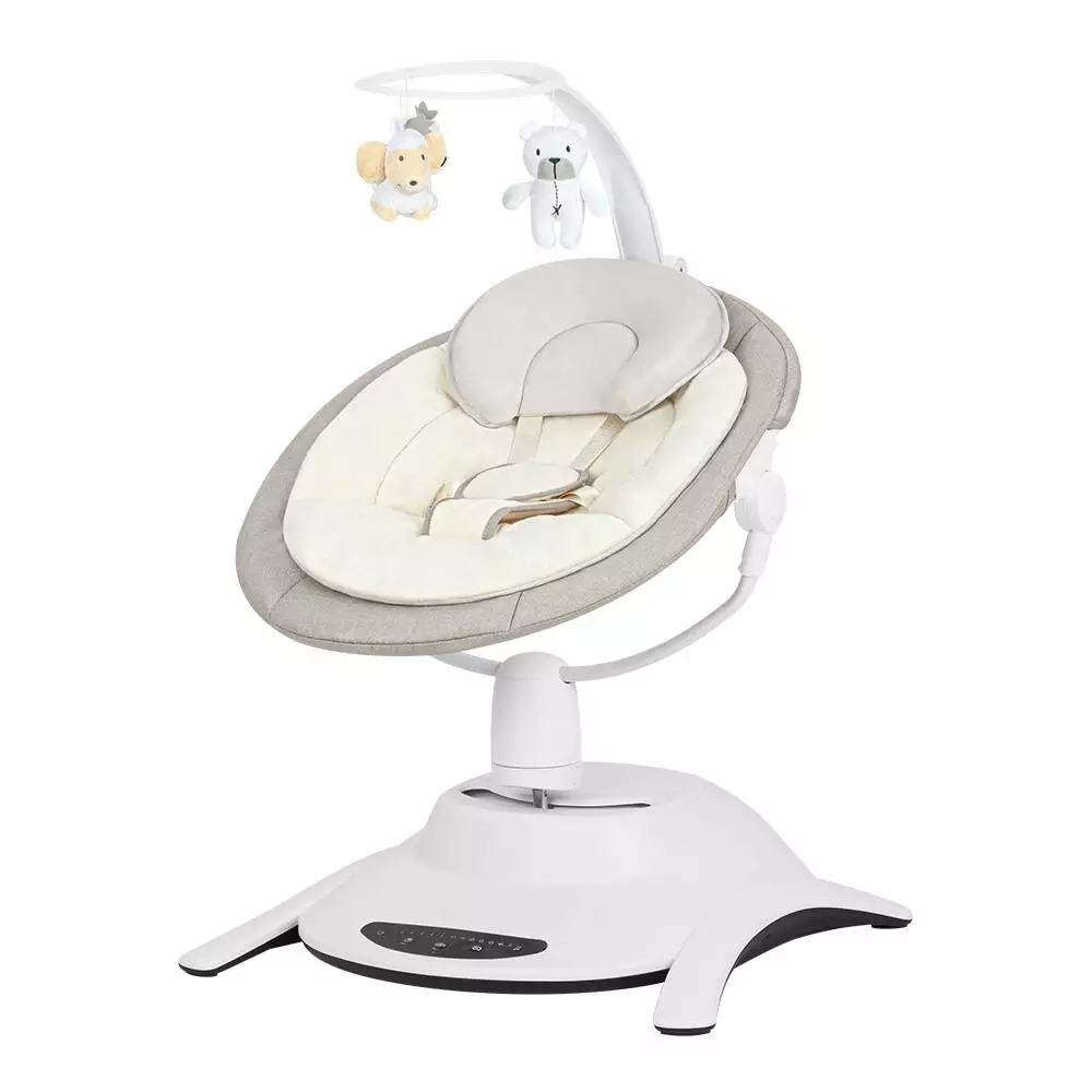 Робота гойдалки змодельована за типом рухів, які дитині нагадують інтуїтивне гойдання. Гойдалка має 6 режимів гойдання - 5 основних і 1 автоматичний, який змінюється кожні 16 секунд. Вибір із 5 режимів гойдання дасть змогу налаштувати інтенсивність відповідно до вподобань дитини. Сидіння обертається на 360°, даючи змогу змінювати напрямок гойдання і налаштовувати сидіння так, щоб завжди можна було підтримувати візуальний контакт з дитиною. Сидіння має 3-ступеневе регулювання нахилу - від лежачого положення, до сидячого. У нічному режимі виріб повільно сповільнюється до повної зупинки. Автоматичний детектор руху вмикає гойдання і музику. Налаштування можна змінювати на сенсорній панелі управління або віддалено за допомогою пульта дистанційного керування. Широке сидіння забезпечує зручне і безпечне положення дитини. Гойдалка має 5-точкові ремені безпеки. У комплект також входить м'яка подушка, яка пристосовується до тіла дитини і забезпечує їй достатню підтримку. У комплект входить карусель з 3 іграшками для тренування уваги дитини. Нековзні накладки захищають підлогу від подряпин. Розміри ящика: 61.50 * 28 * 51.50